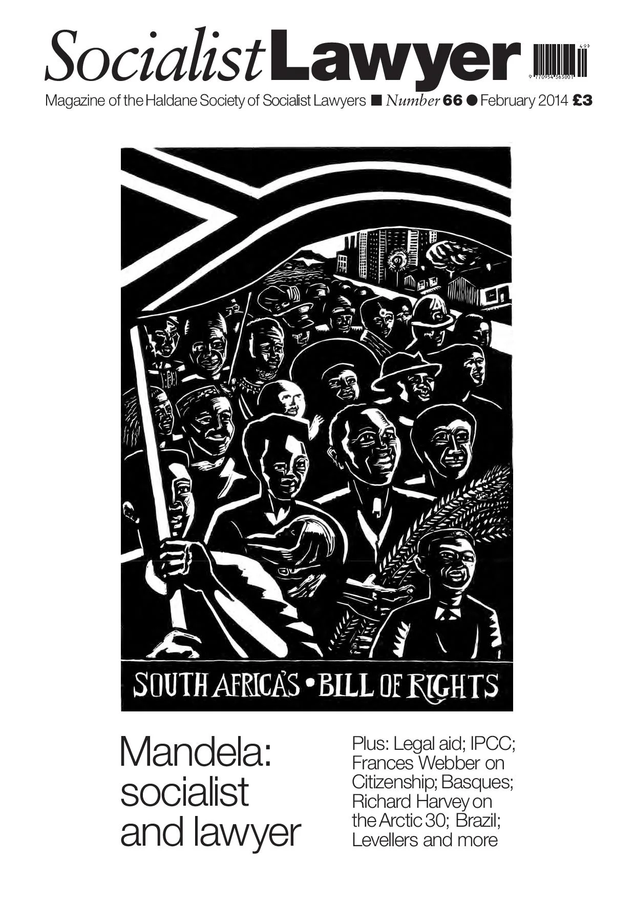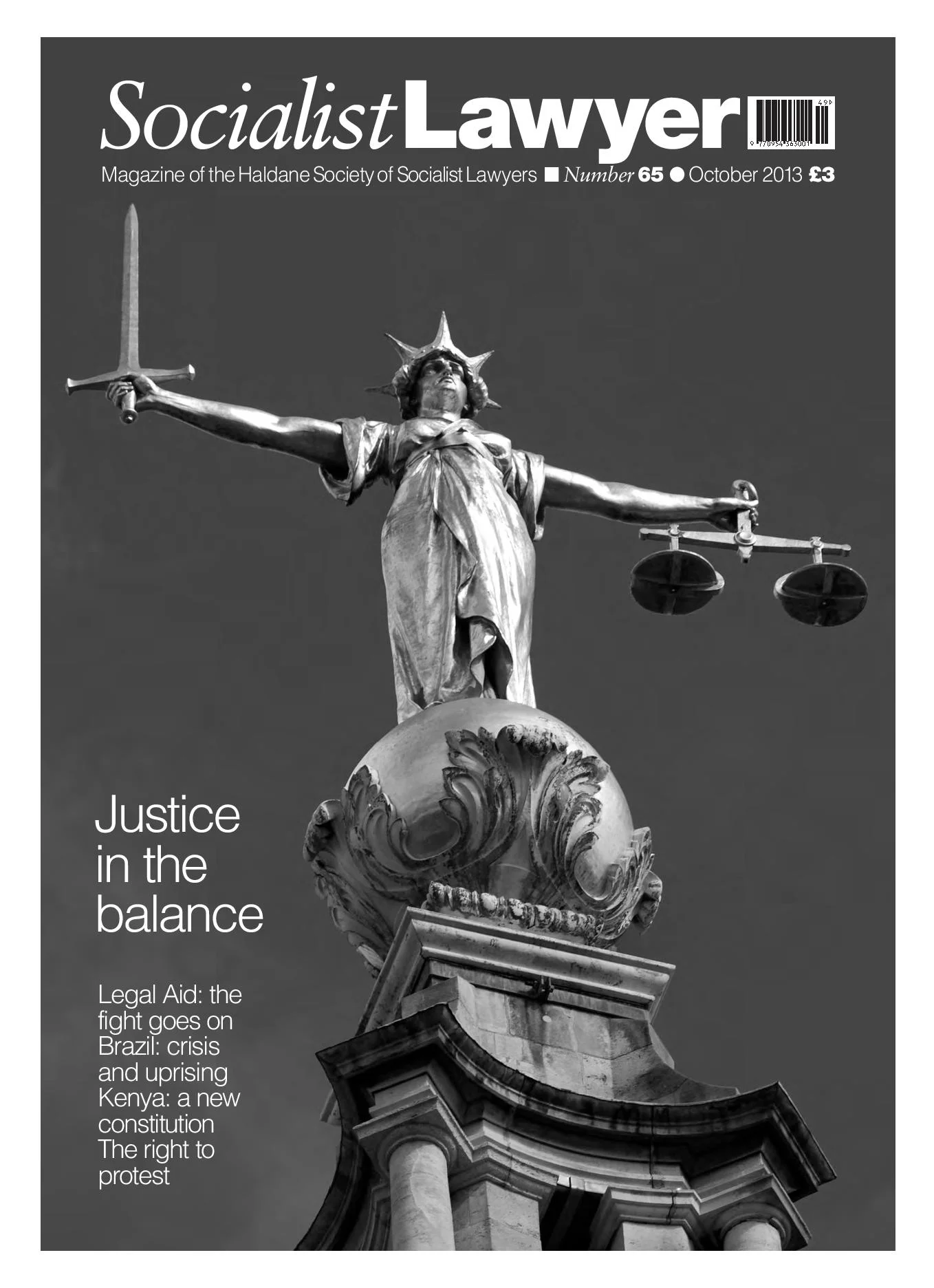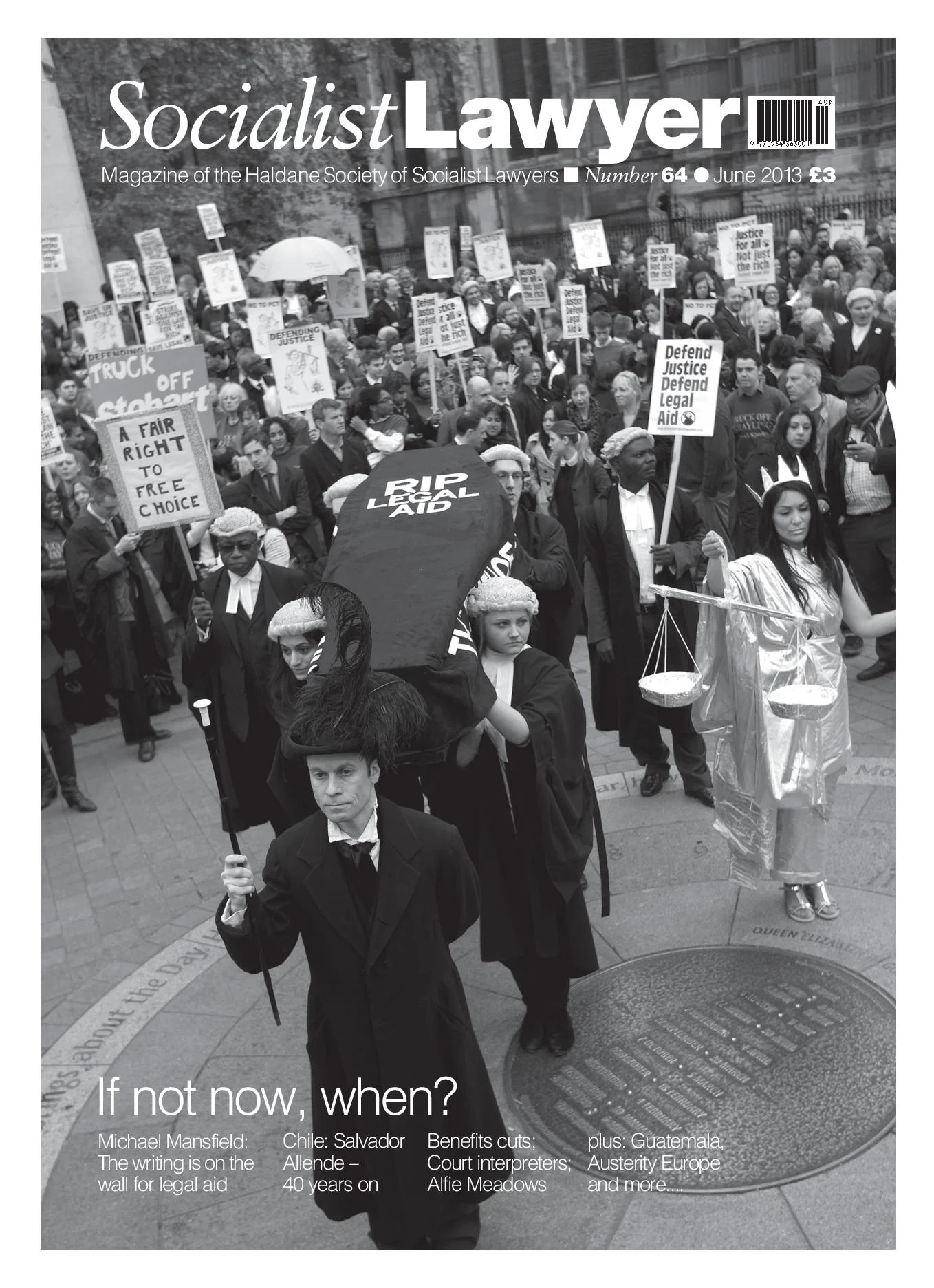 Socialist Lawyer 64 focuses on the continuing campaign to save legal aid which has been gathering momentum throughout 2013. As the front cover depicts, solicitors and barristers have staged demonstrations in the face of the further round of cuts proposed to both criminal and civil legal aid. This issue features analysis of the consequences that will result from the proposed cuts and offers a rallying call to save legal aid as an essential part of the welfare state. There are also articles in this issue looking at: the fall-out already being felt by the most vulnerable in society from cuts to benefits; the trial of Alfie Meadows; and the attempts in Guatemala to bring the former dictator Ríos Montt to justice.