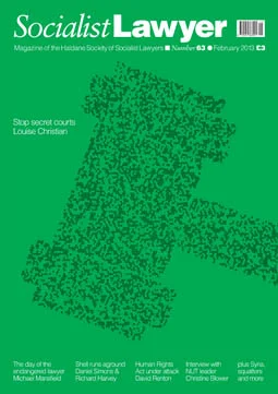 ‘Socialist Lawyer 63 features analysis by Louise Christian of the Government’s proposals for secret courts, a look at new laws on squatting from the Advisory Service for Squatters, reports on Syria and Colombia, an interview with the leader of National Union of Teachers, Christine Blower, Michael Mansfield’s call for the protection of persecuted lawyers around the world as part of the ‘Day of the Endangered Lawyer’, and much more.’