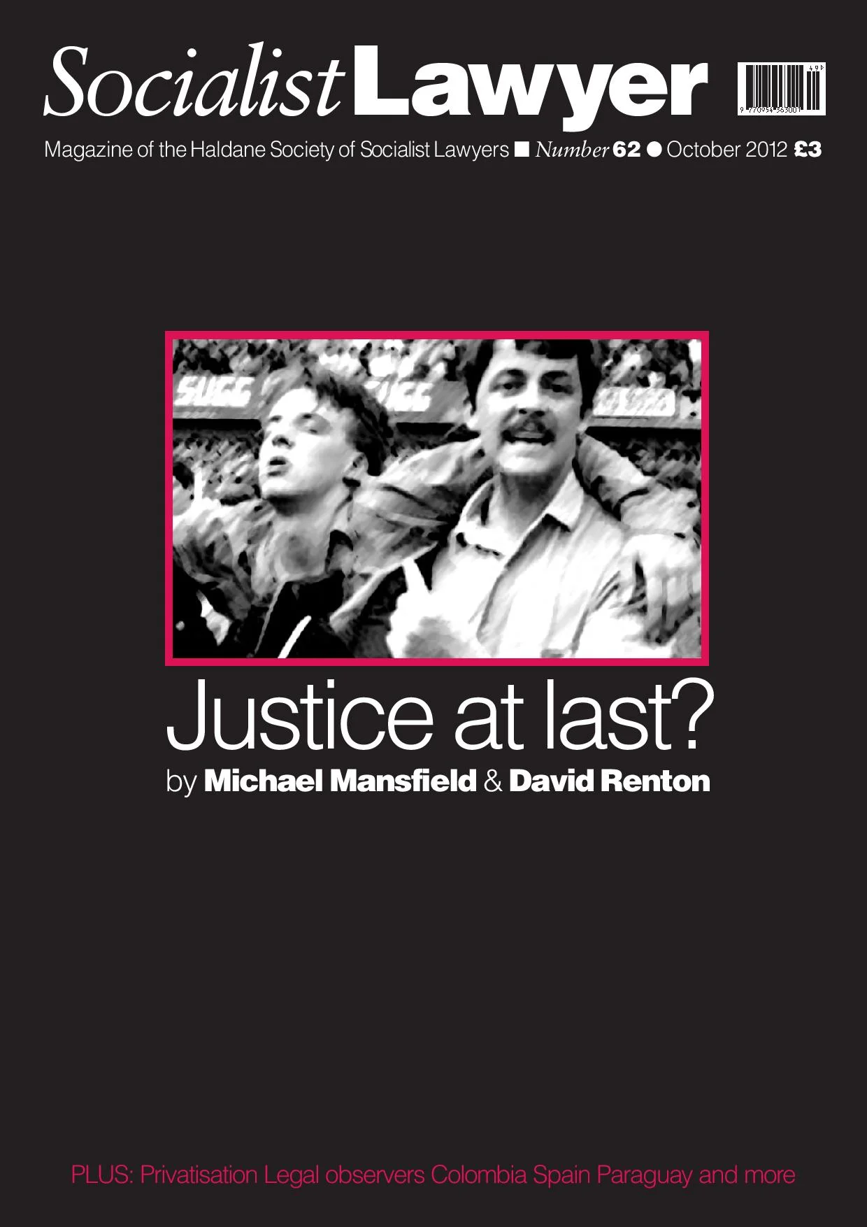 In this issue of Socialist Lawyer (No 62) published by the Haldane Society of Socialist Lawyers, President Mike Mansfield writes on the parallels between the Report of the Independent Panel on Hillsborough and the Saville Report into Bloody Sunday. Mike Mansfield represented some of the families in both inquiries.