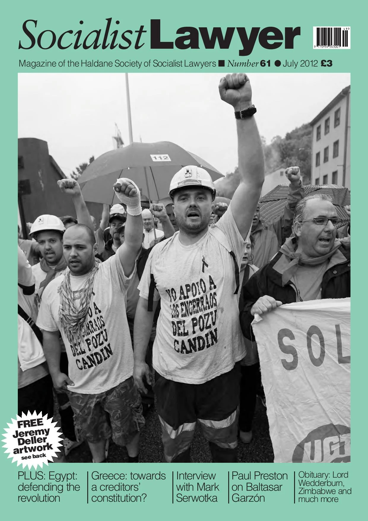 The 61st edition of Socialist Lawyer goes to the printers as austerity measures and cuts to public spending continue to bite in the UK and across the continent. Challenges to those in favour of austerity are being made. In this edition PCS General Secretary Mark Serwotka gives an interview in which he discusses his views on austerity and the challenges ahead for the public sector. There is analysis of the friction between the Greek constitution and austerity. We also look back at the incredible life of the eminent socialist lawyer and Haldane vice-president Lord Wedderburn. Turner prize winner Jeremy Deller has kindly donated a piece of his artwork which is but one feature of an edition that looks at issues including legal aid, the Olympics, school exclusions and much more.